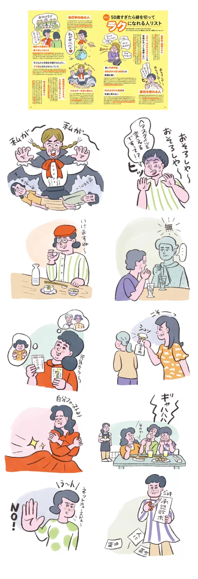 宝島社ムック『50歳すぎたらやめて人生ラクになる100のこと』 2025 3/01 2025年3月1日宝島社ムック『50歳すぎたらやめて人生ラクになる100のこと』(2025/2/26発売) 「50歳すぎたら縁を切ってラクになれる人リスト」と「ラクになる大人の付き合い術」の挿絵を担当しました。(イラストは一部のみ抜粋) works ハルメク 2025年2月号 MORE春号(2025年2月28日売)