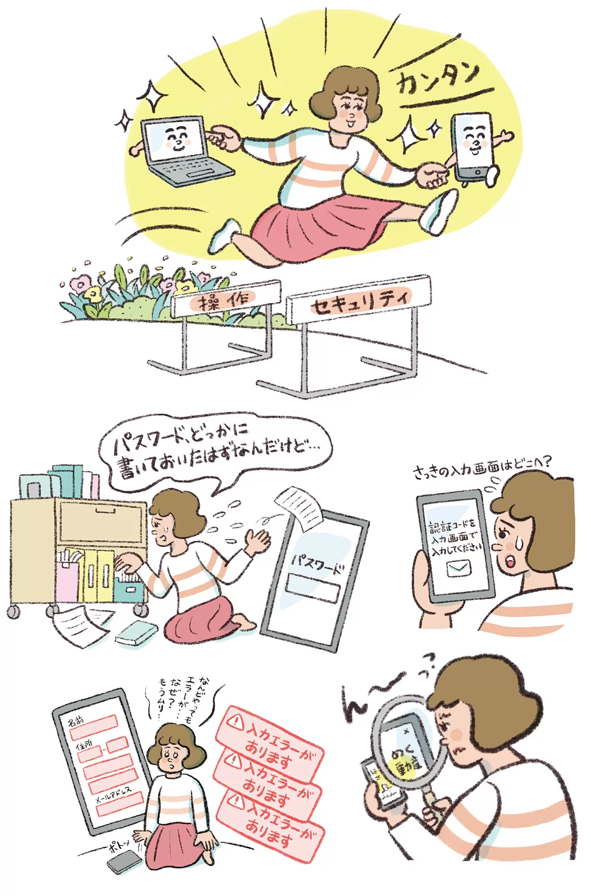 「スマホの操作&セキュリティの困ったを突破する方法」特集の挿絵を担当しました。(イラストは一部のみ抜粋)